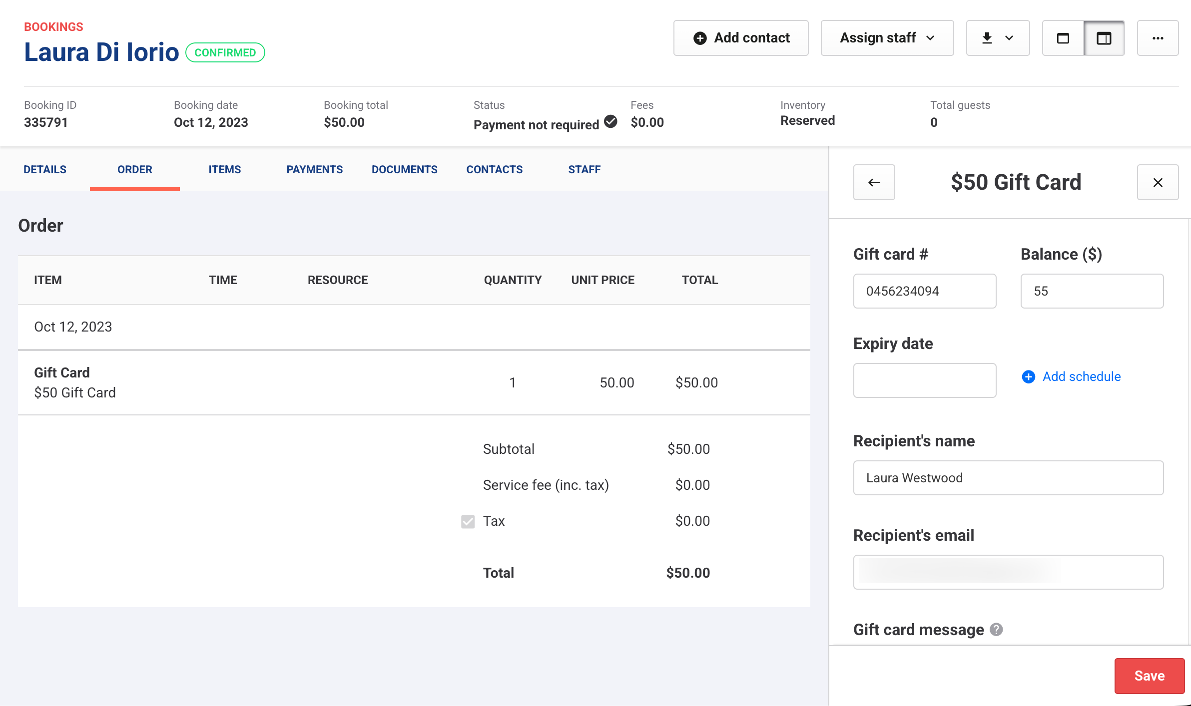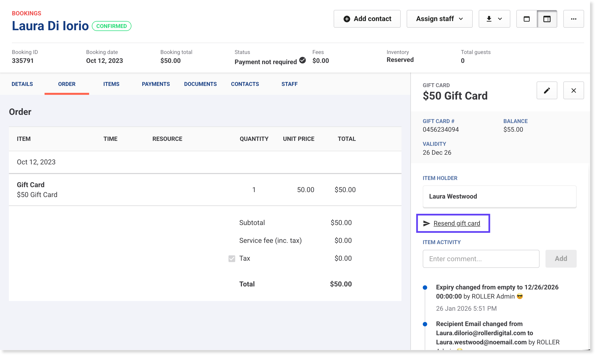 Or search for the booking, then from the booking's Items tab, select the gift card item to view gift card details.