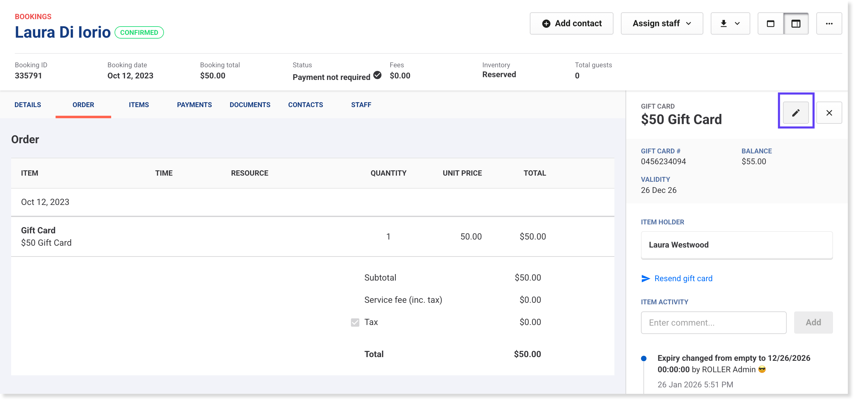 We don't recommend editing the gift card balance here, as no transaction will be recorded in ROLLER reports, and accounts won't balance. If you want to add more money to a gift card, issue a new gift card instead. - Select Save.