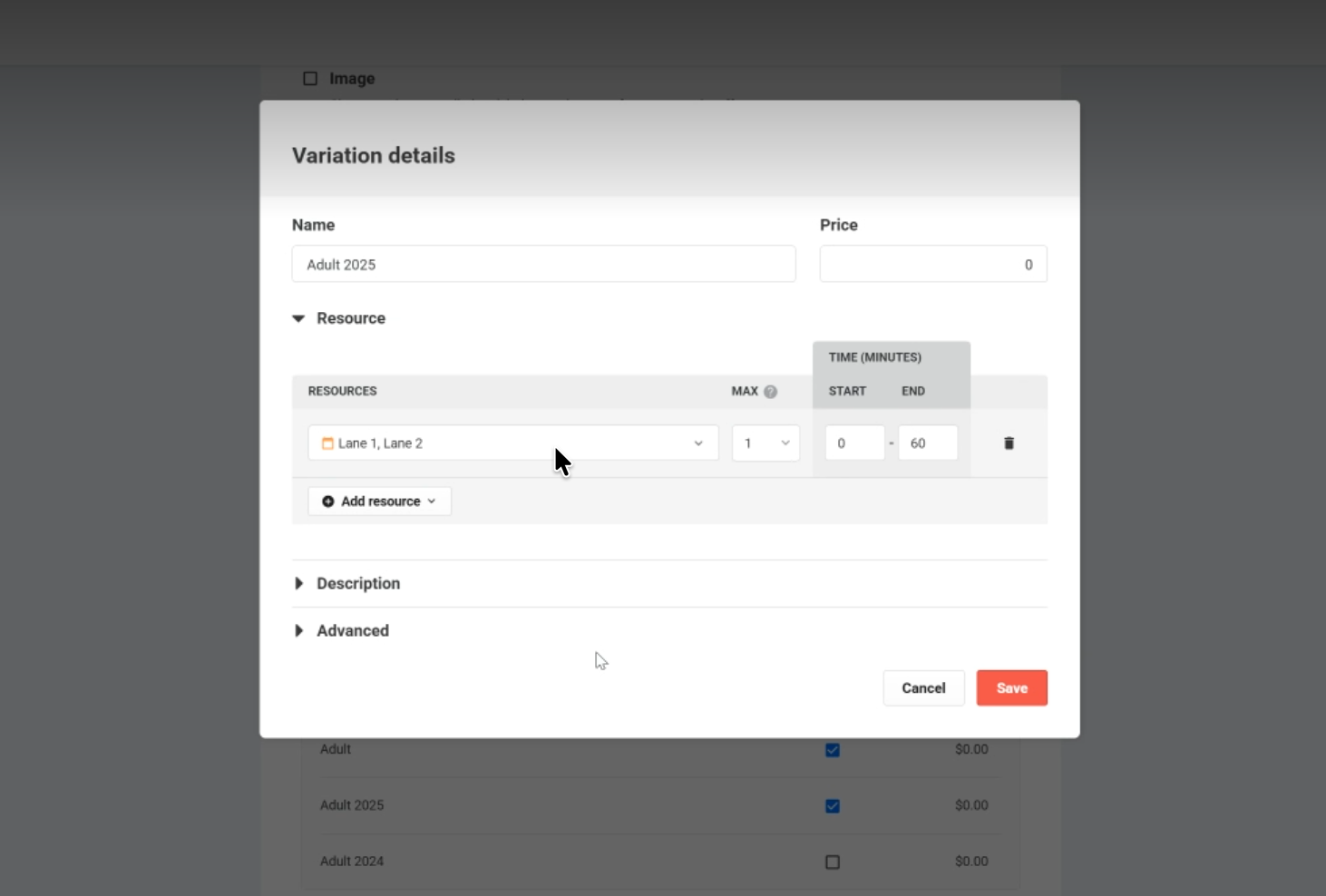 The new variation uses copied resource allocation from another variation in the same product. Managed venues must review the setup to make sure the variation is correct for your venue.