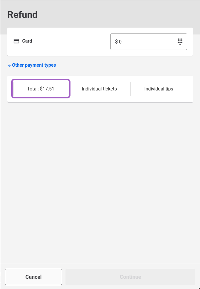 When you tap the Total button on the Refund screen at POS, it refunds only the booking amount - excluding any tips. This can cause confusion if a guest expects to receive a full refund that includes their tip.