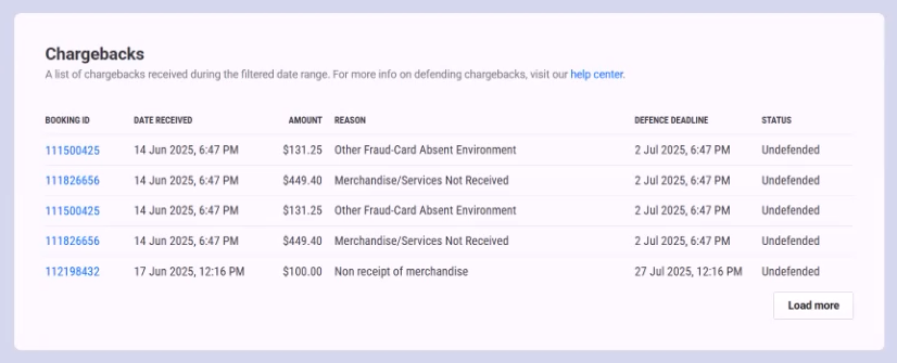 - Using the Chargebacks table, find the Booking ID of the chargeback. If it does not appear on the list, select Load More.