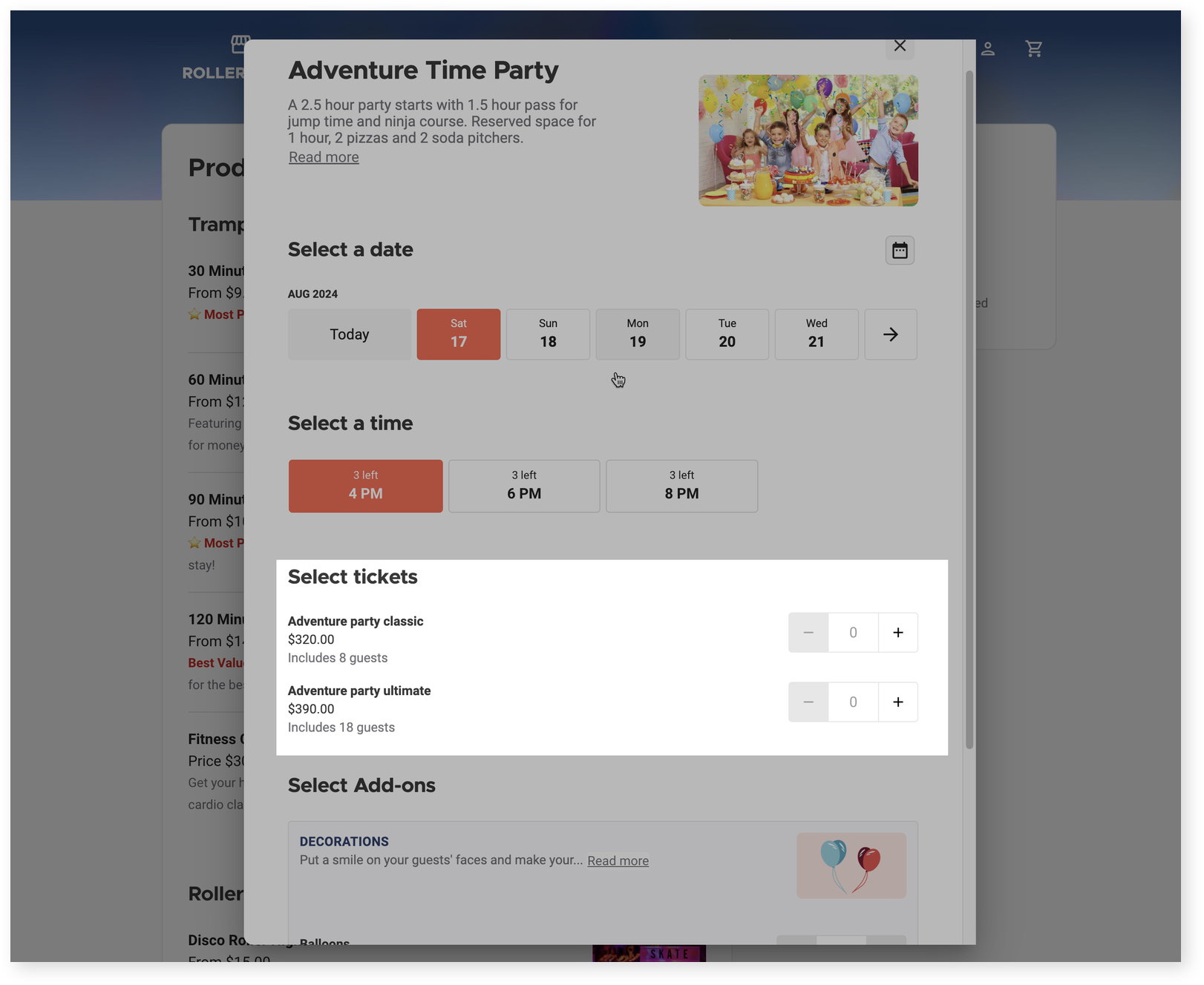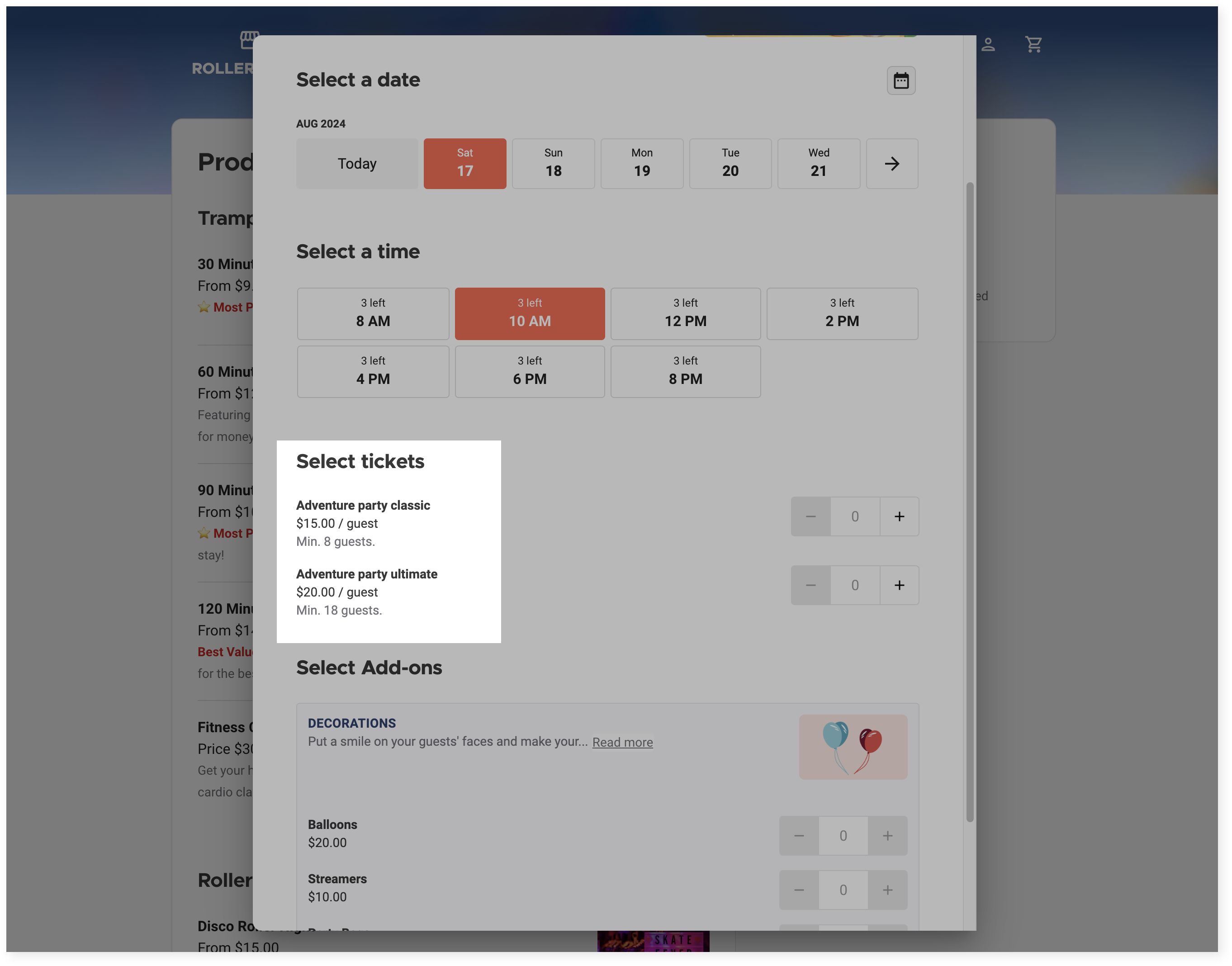 When selecting tickets, the minimum number of guests is displayed, along with the per-guest cost.