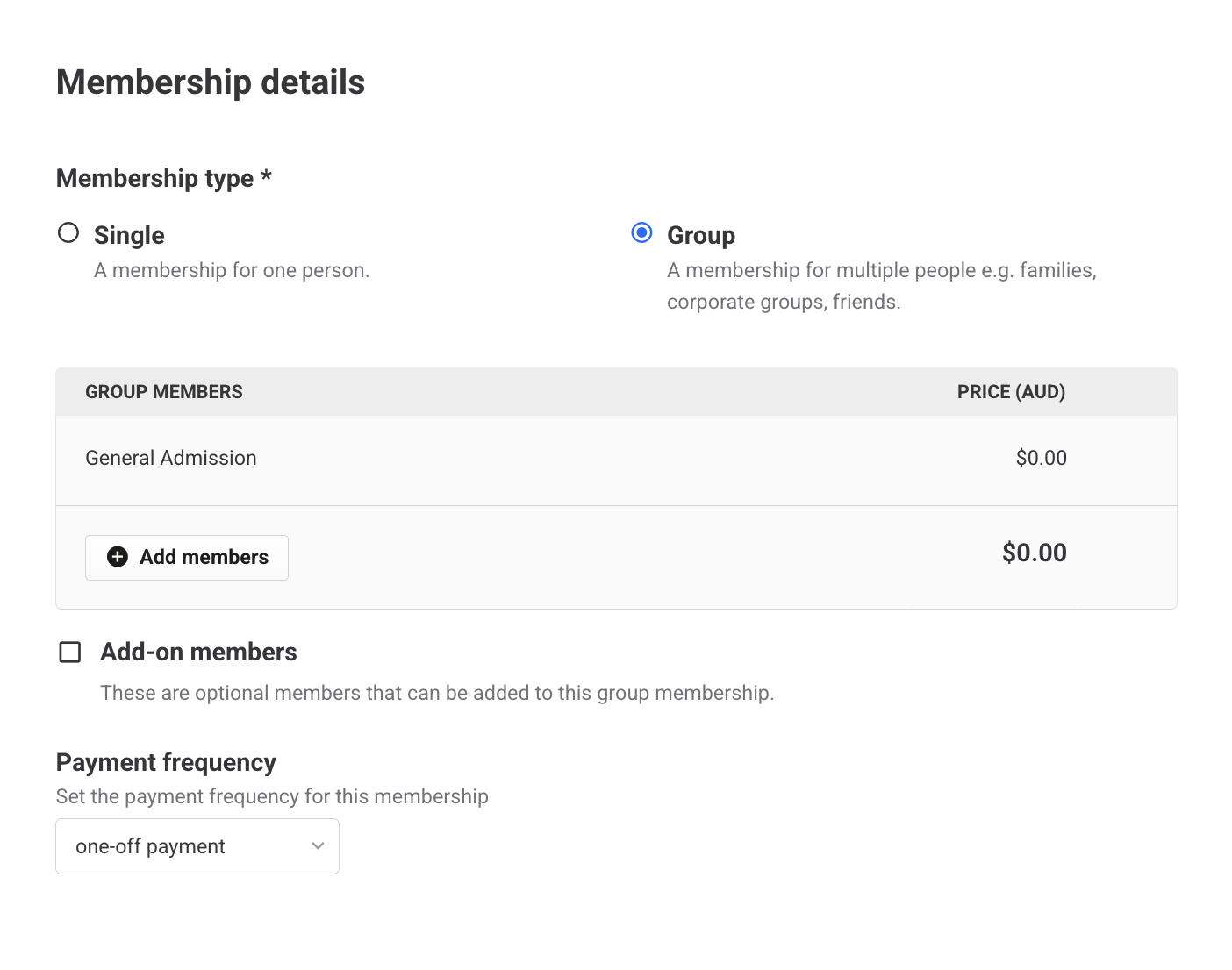 - (Optional) Allow add-on members (eg additional children). Additional members can be added at no extra cost or for a set price.