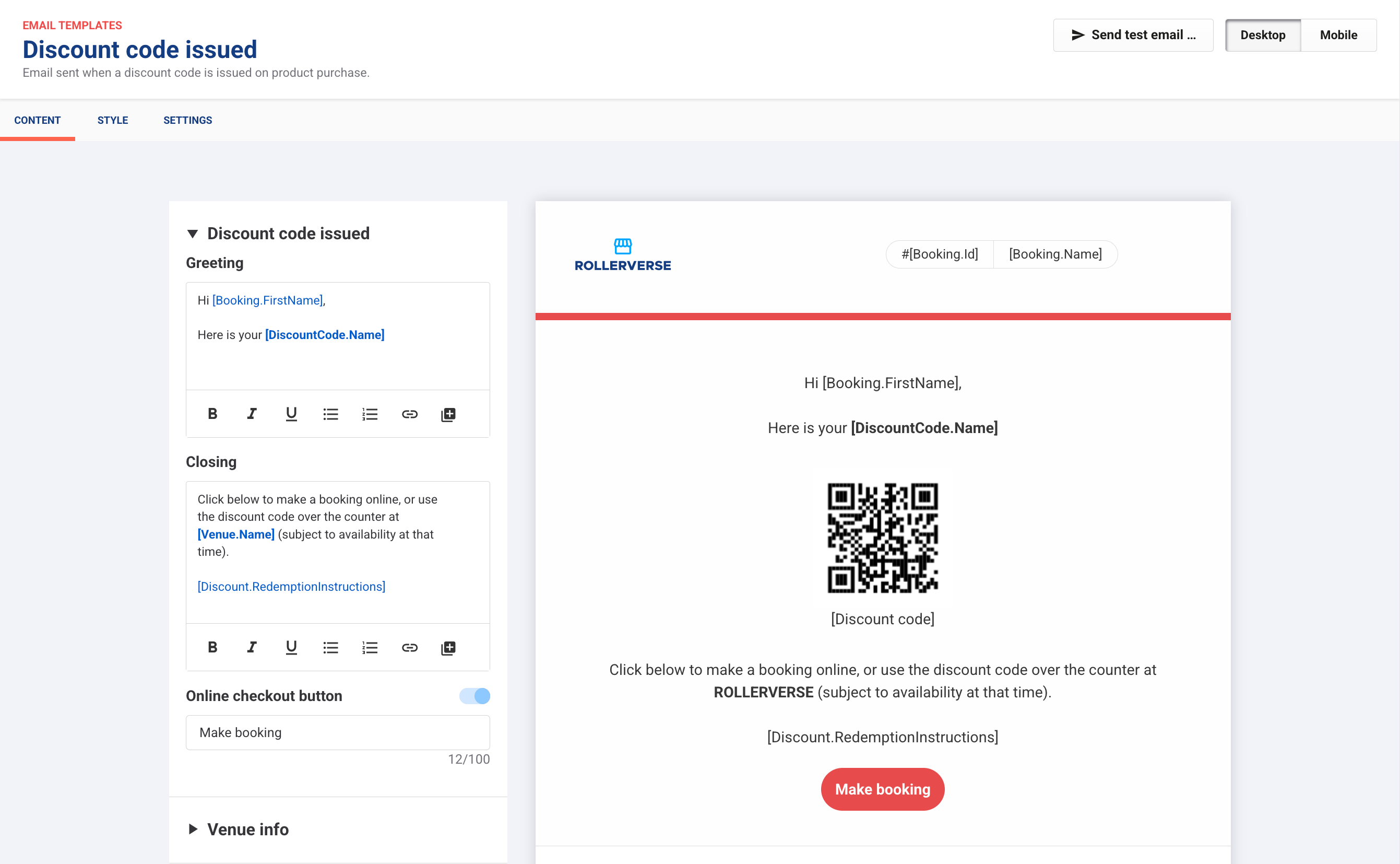 - In Venue Manager, go to Settings > Design > Email templates.