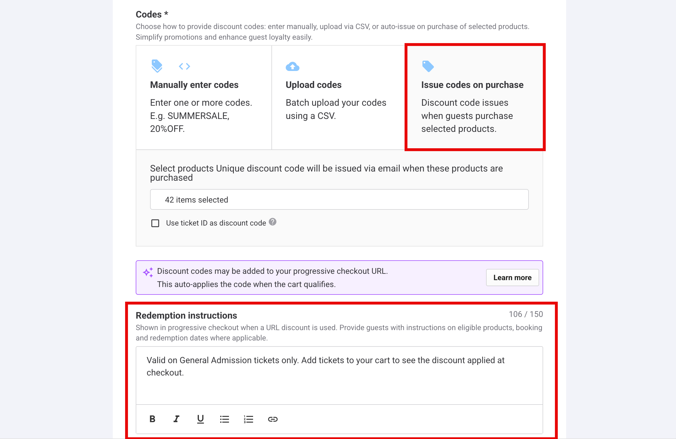 - Redemption instructions (pulled directly from the discount code’s settings)