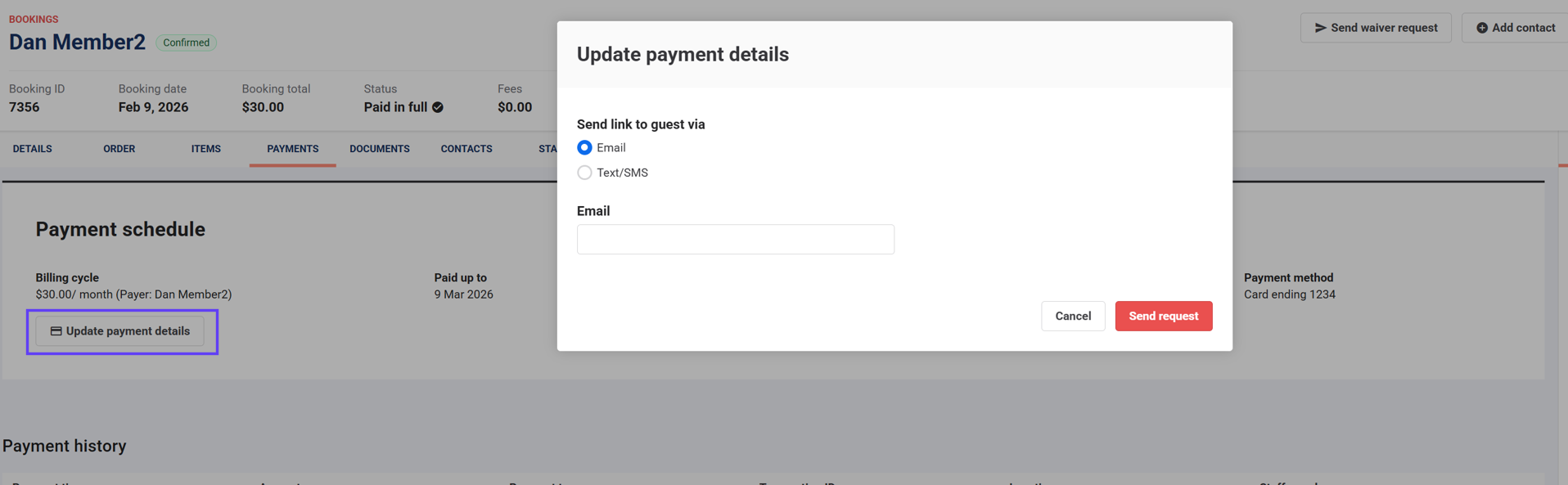 When a member calls your venue to change the card used for recurring membership payments (eg card expired, new card), send them a secure link to update their payment details by email or SMS. The member enters their card details themselves on a secure payment page. Once they submit the form, their new card details are saved for future recurring payments.