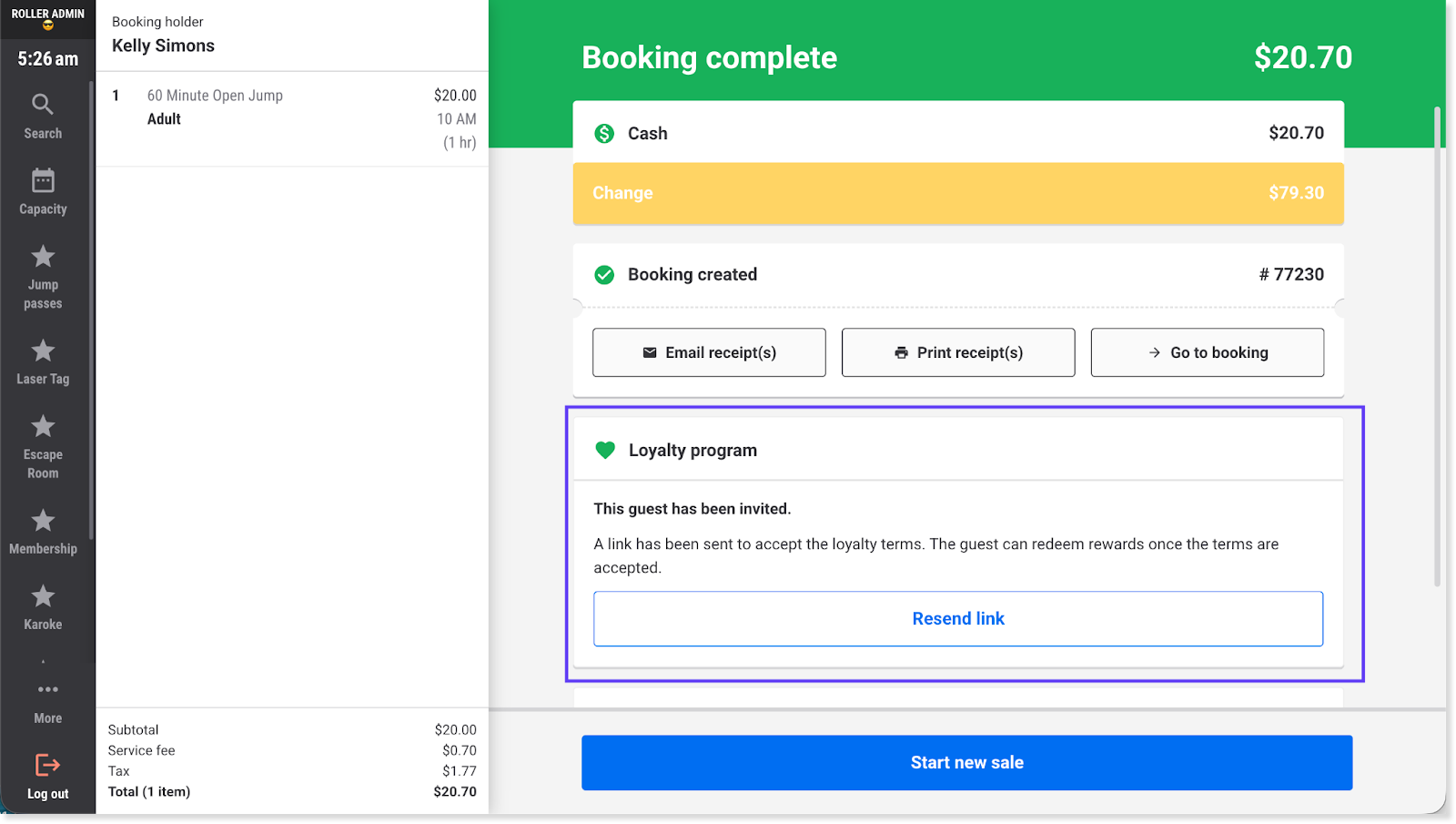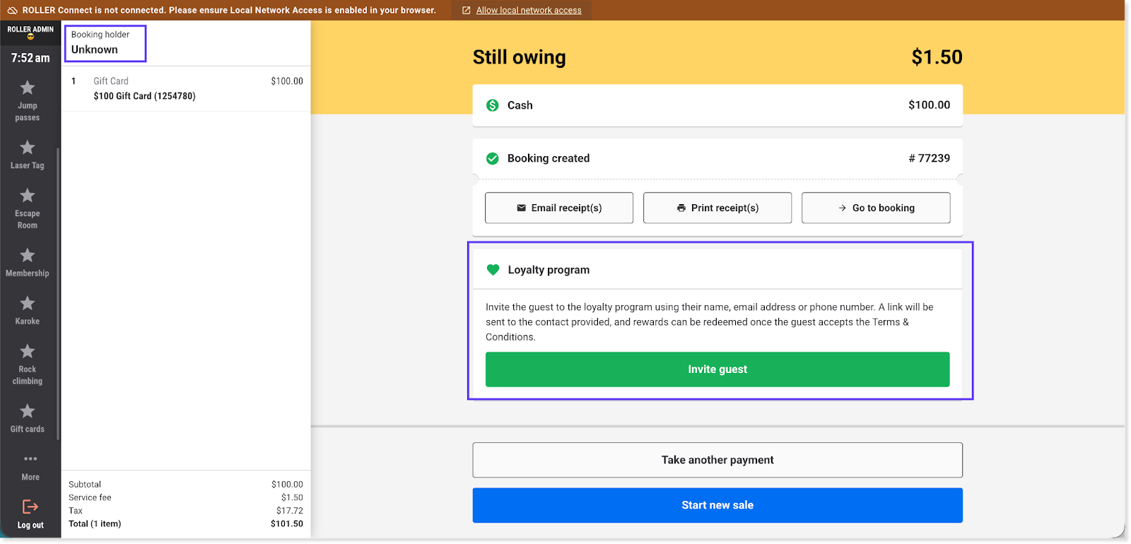 If a POS transaction is completed before a booking holder is assigned, staff can still invite the guest to join the loyalty program from the booking complete screen.