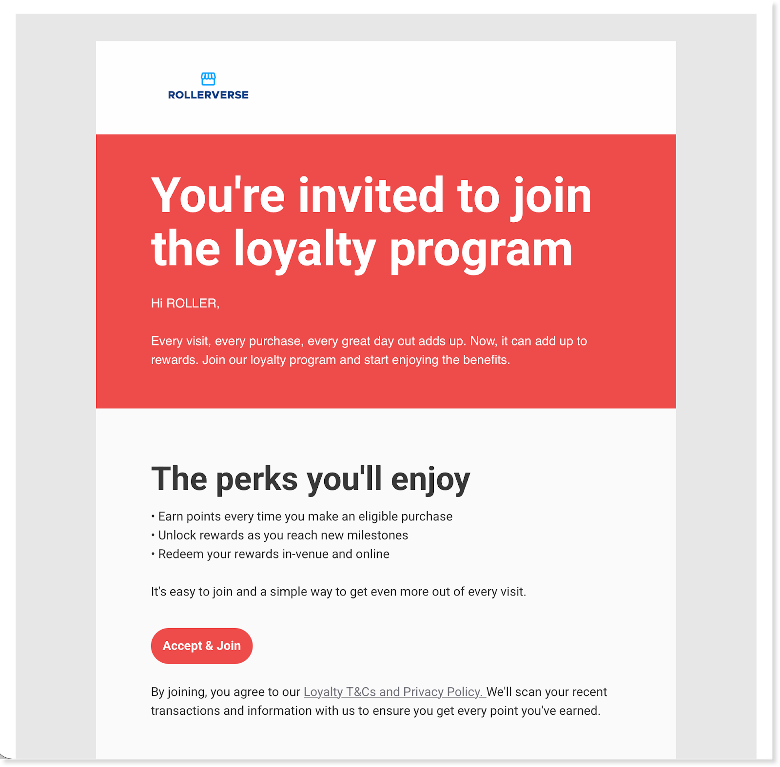Once loyalty rules are activated for your venue, guests receive an email invitation to join loyalty after making a purchase online or at POS, or after contacting venue staff and a booking is made in Venue Manager, provided they are subscribed to the mailing list.