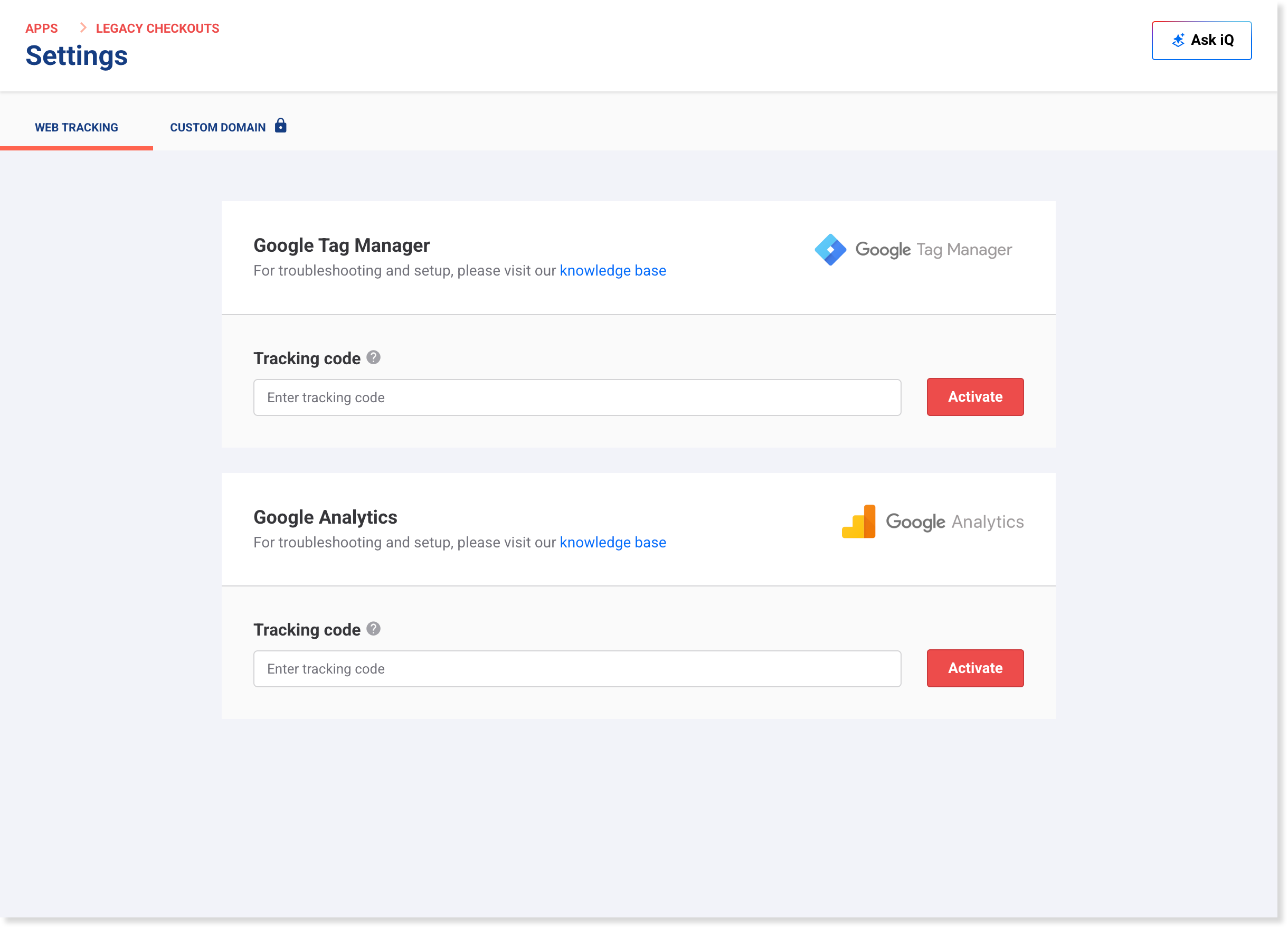 - Under Google Tag Manager or Google Analytics, paste your tracking code into the Tracking code field.