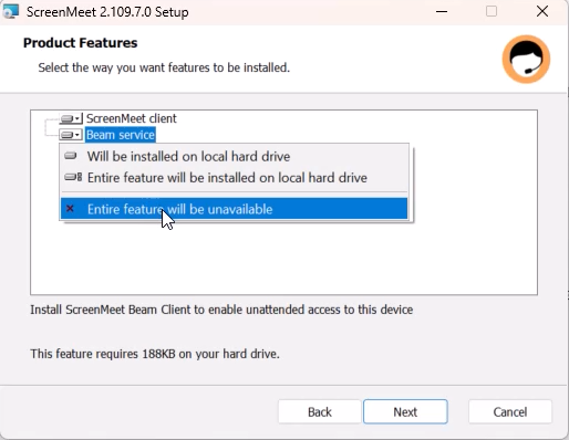 - Select Beam Service from the product features menu and select Entire feature will be unavailable.